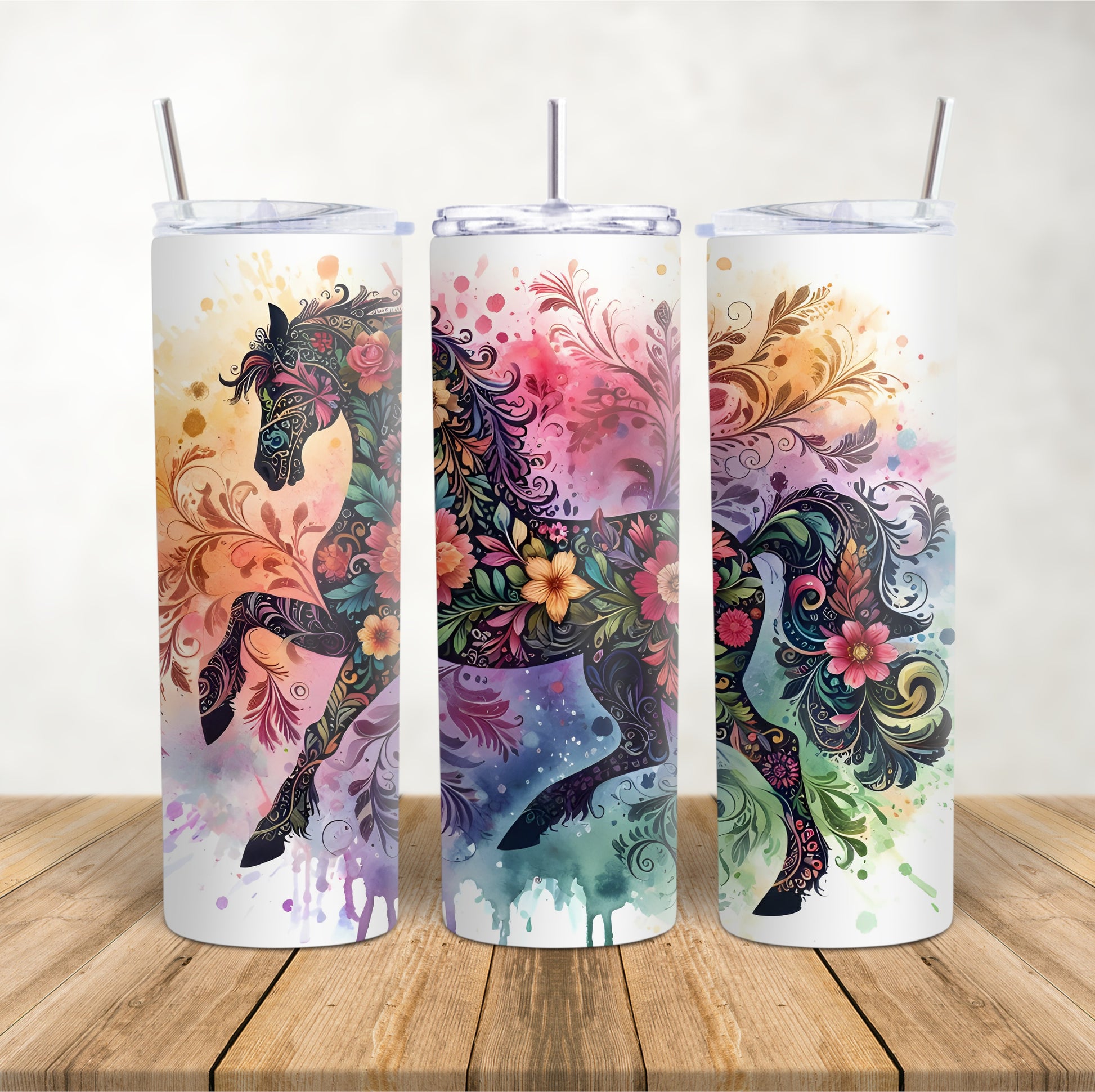 20oz Skinny Tumbler for hot & cold drinks prancing floral watercolour horse