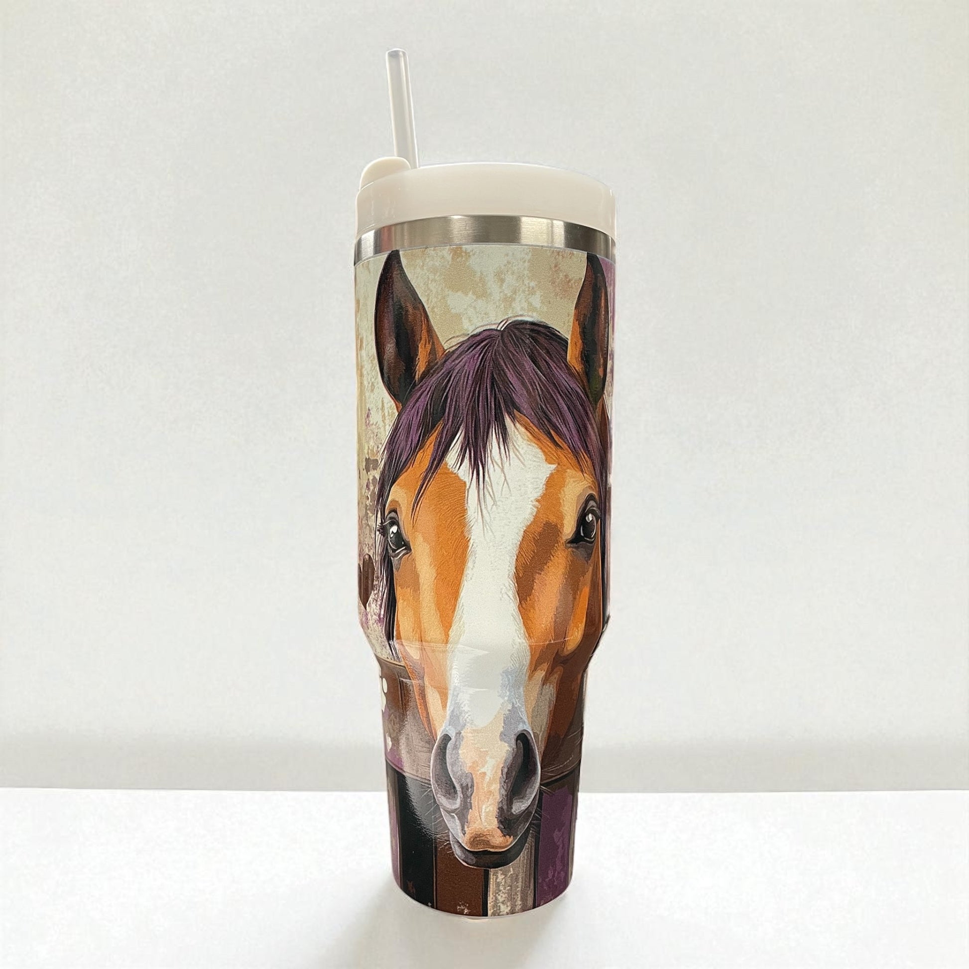 40oz Tumbler "Bay horse with blaze brown/purple" large cup with handle & straw (203)