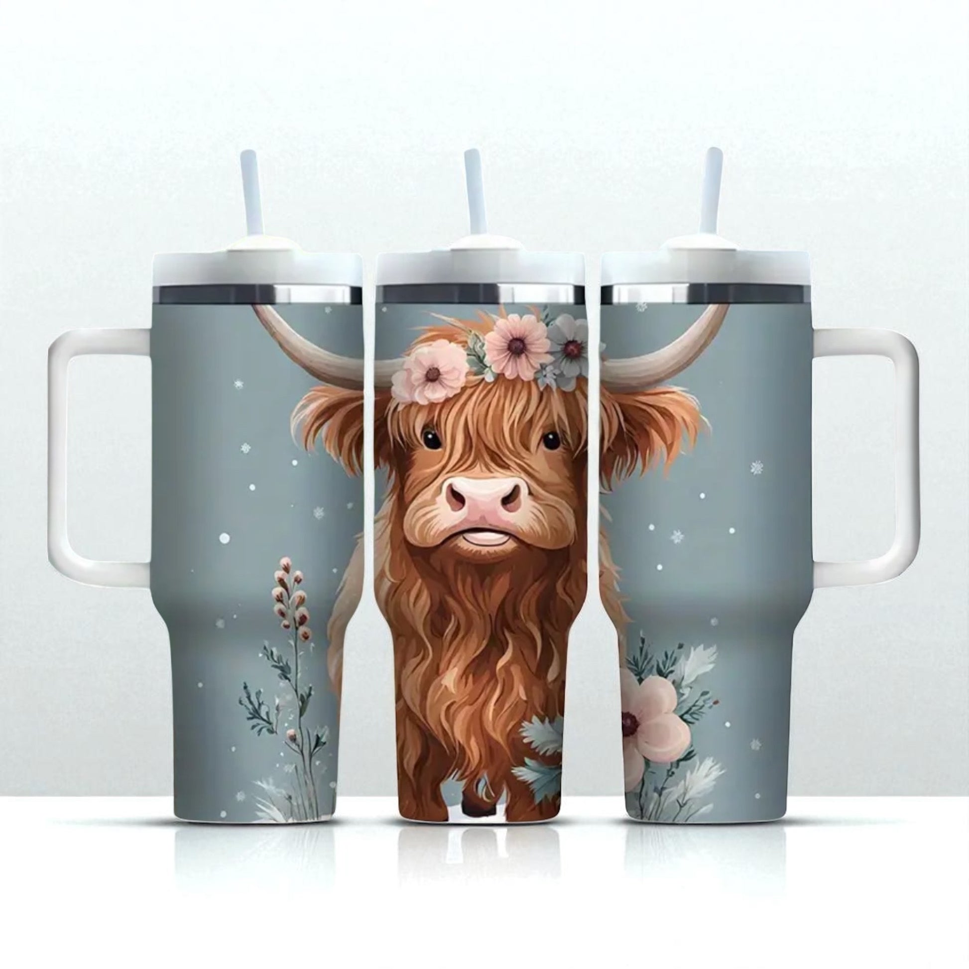 40oz Tumbler "Floral Highland Cow blue/grey/pink" large cup with handle & straw (204)