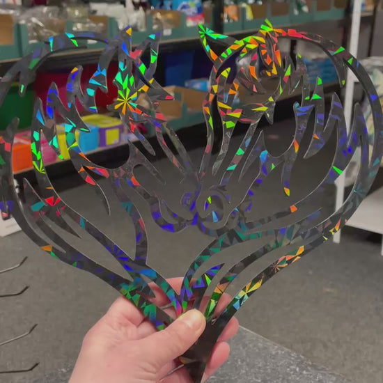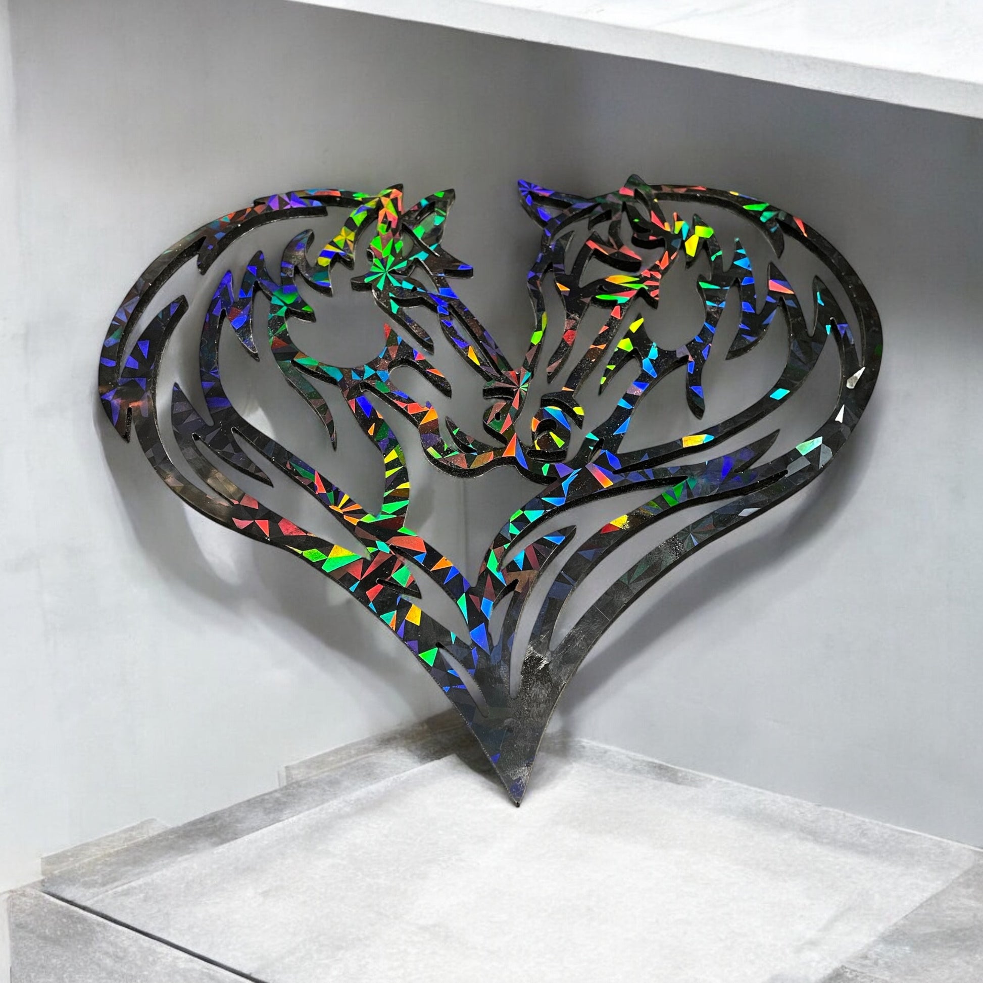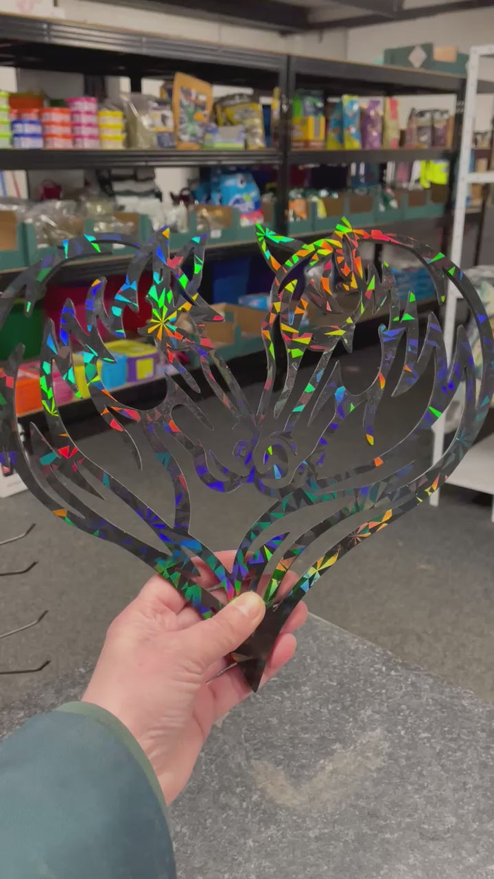 Gorgeous horse heads/heart resin wall art with a rainbow holographic effect. Supplied on metallic cord for hanging. Handmade in my UK workshop.